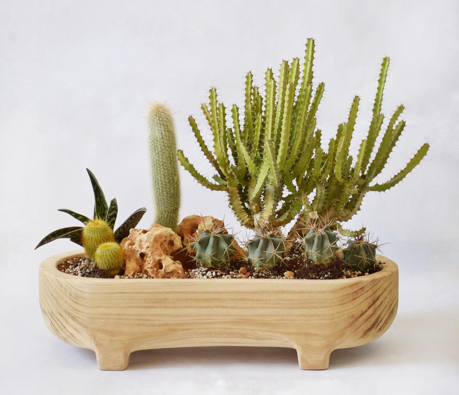 סידור סוקולנטים קטנים באדנית עץ מלבנית טבעית מגולפת עם רגליים.